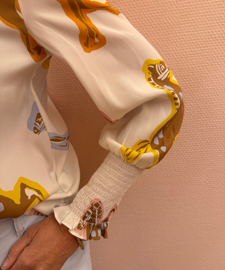Stretch silk blouse from Herzens in earth tones. Wide, smock cuffs.