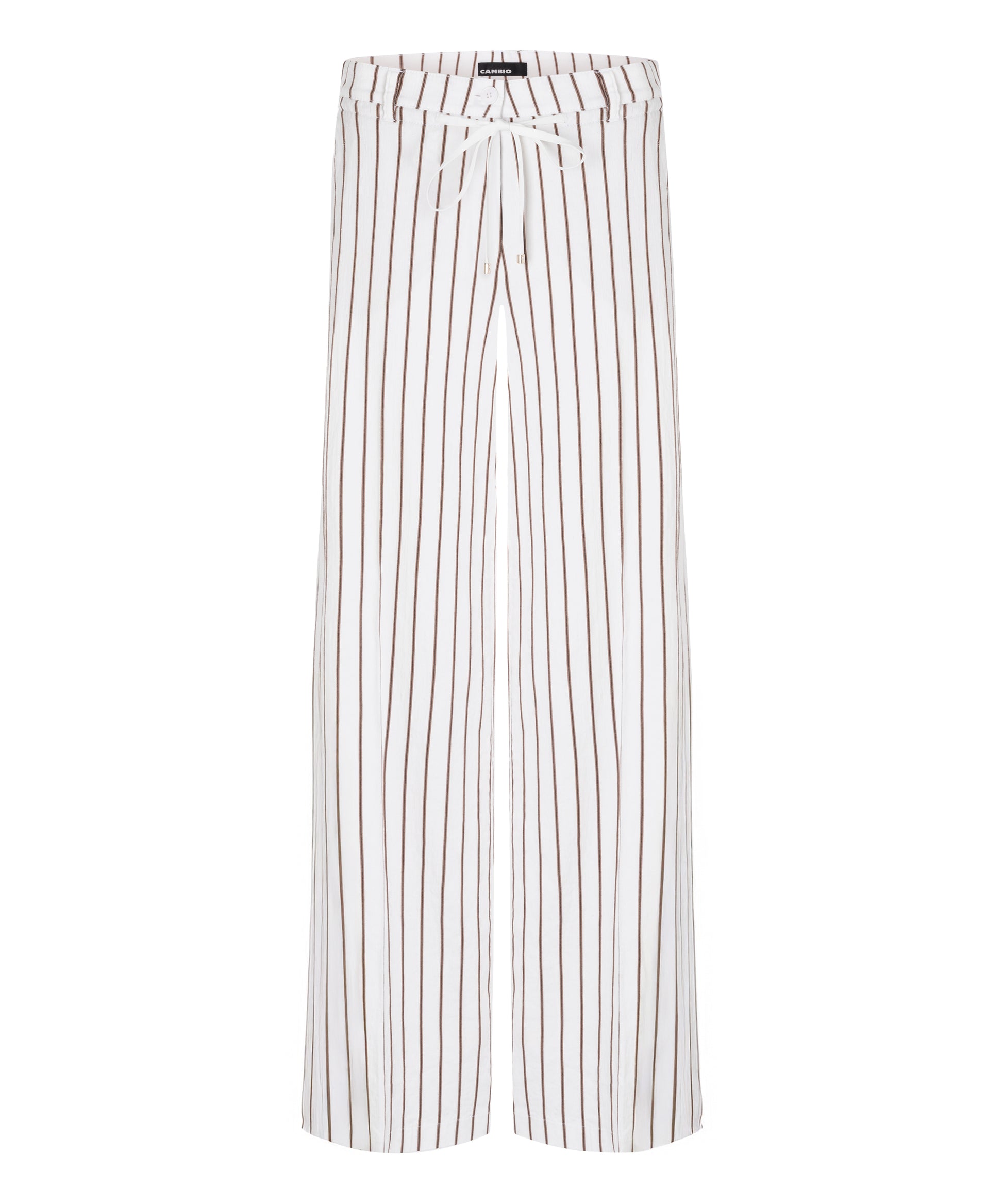 Wide, striped trousers from Cambio. Side pockets, patch pockets at the back, drawstring waist, and straight legs.
