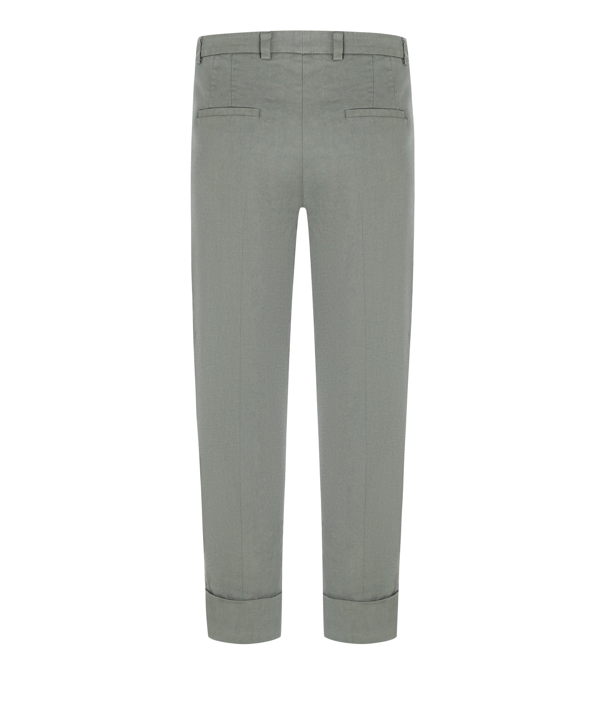 Groene broek van Cambio. Hoog in de taille, steekzakken en een omslag onderaan de pijpen.