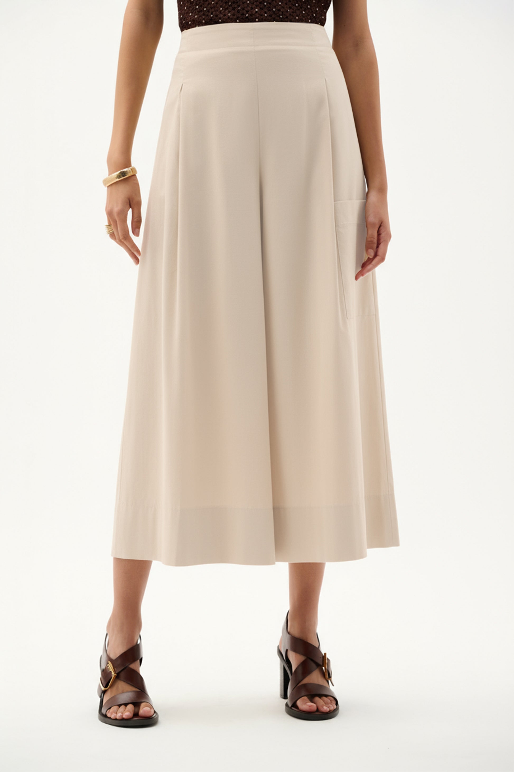 Deze culottebroek is gemaakt van stretchpoplin en heeft een omgeslagen tailleband aan de voorkant en een elastische achterkant. Plooiingen aan de voorkant zorgen voor een zachte structuur, terwijl een enkele zijzak de broek praktisch maakt. Vallen erg ruim op maat.