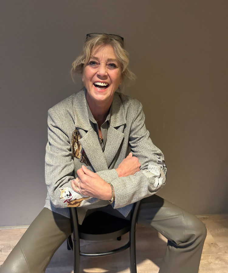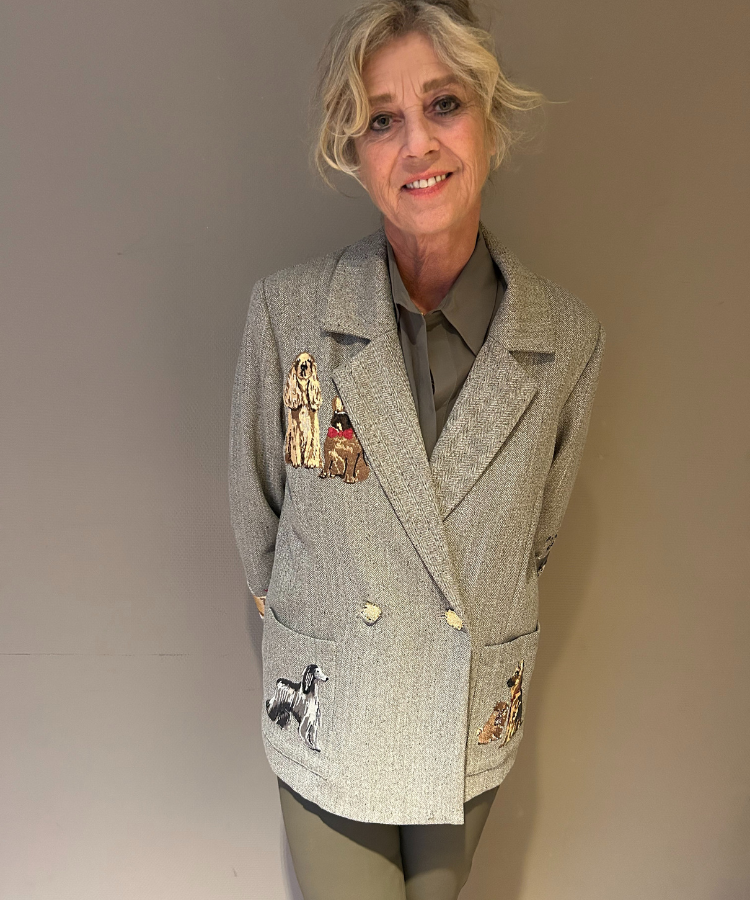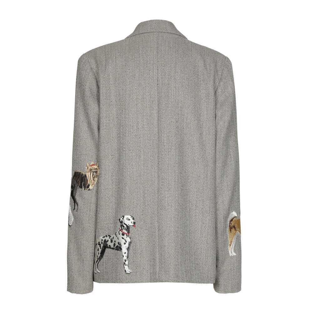Bijzondere, rechtvallende blazer van Caroline Biss met honden als afbeelding. Dubbele knoopsluiting en opgestikte zakken aan de voorkant.