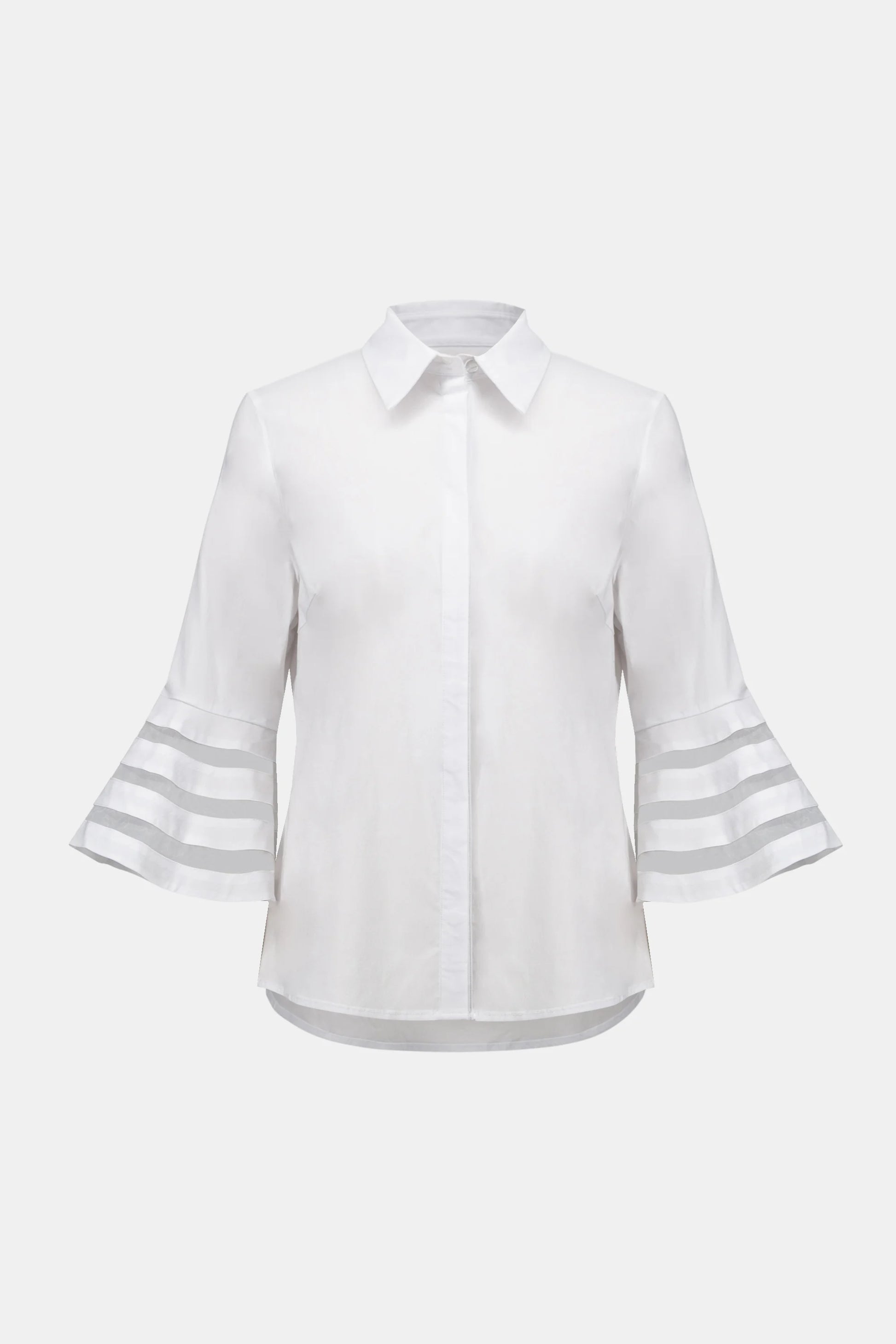 Deze blouse van stretchviscose en nylon heeft een recht model met wijde mouwen, afgewerkt met organza-inzetten. De ronde hals en elegante mouwen maken deze ongevoerde blouse perfect voor een stijlvolle maar toch ontspannen look.