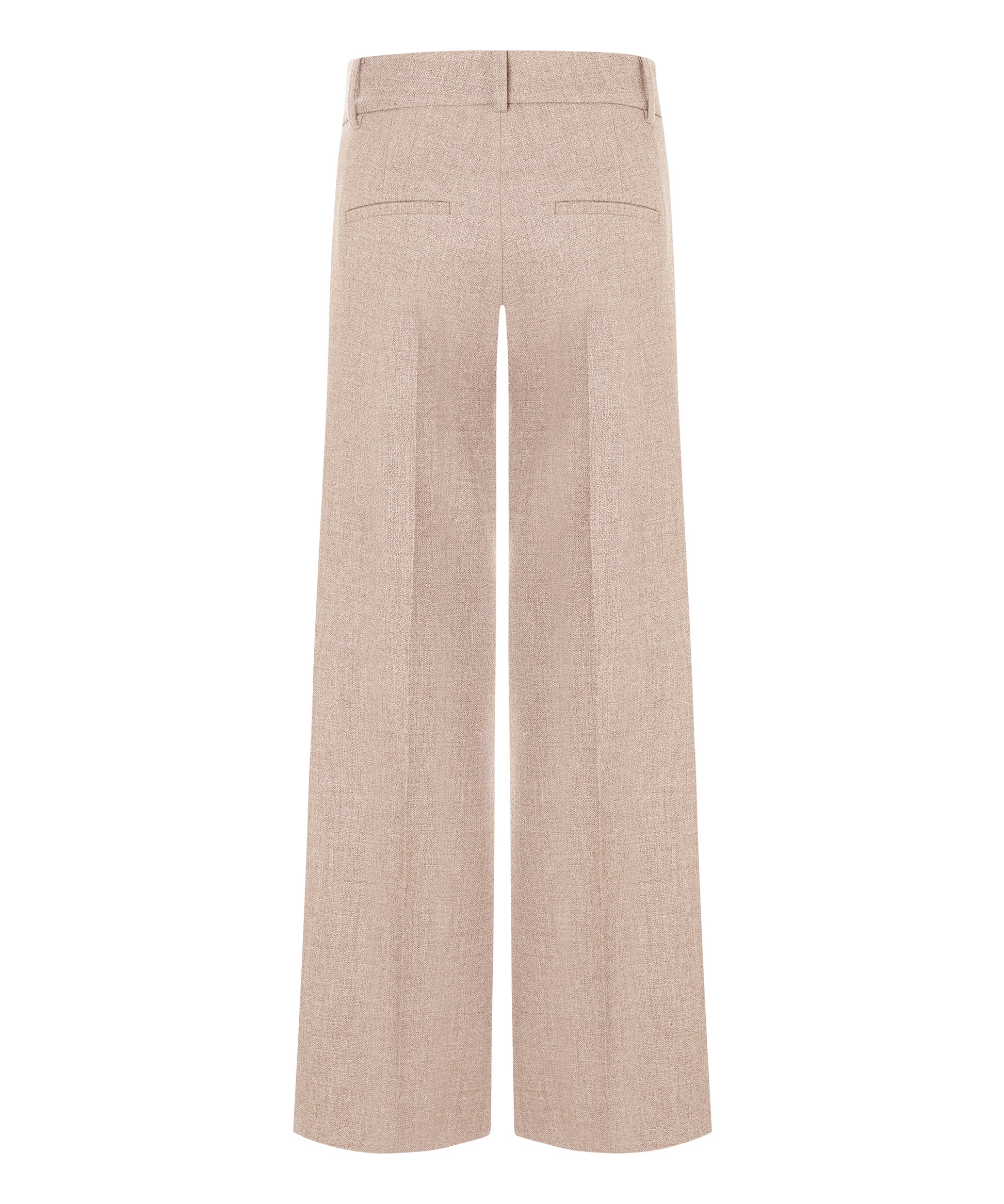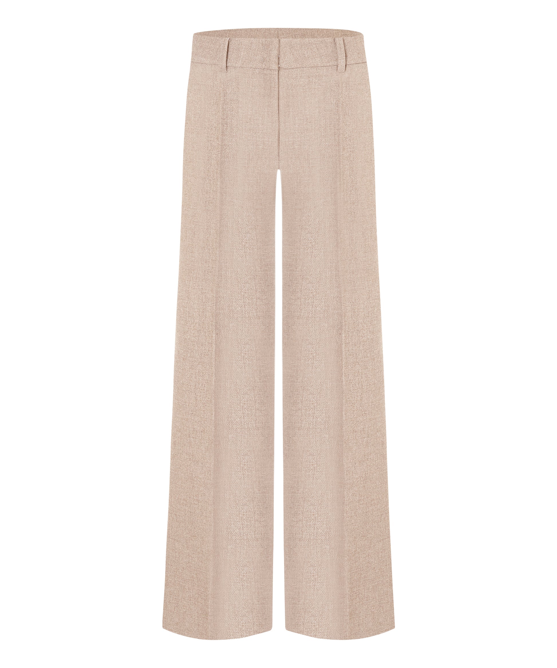 Een wide fit model broek van Cambio in een zachte, beige tint. Hoog in de taille, steekzakken en rechte pijpen. De stof voelt zacht aan en draagt comfortabel.