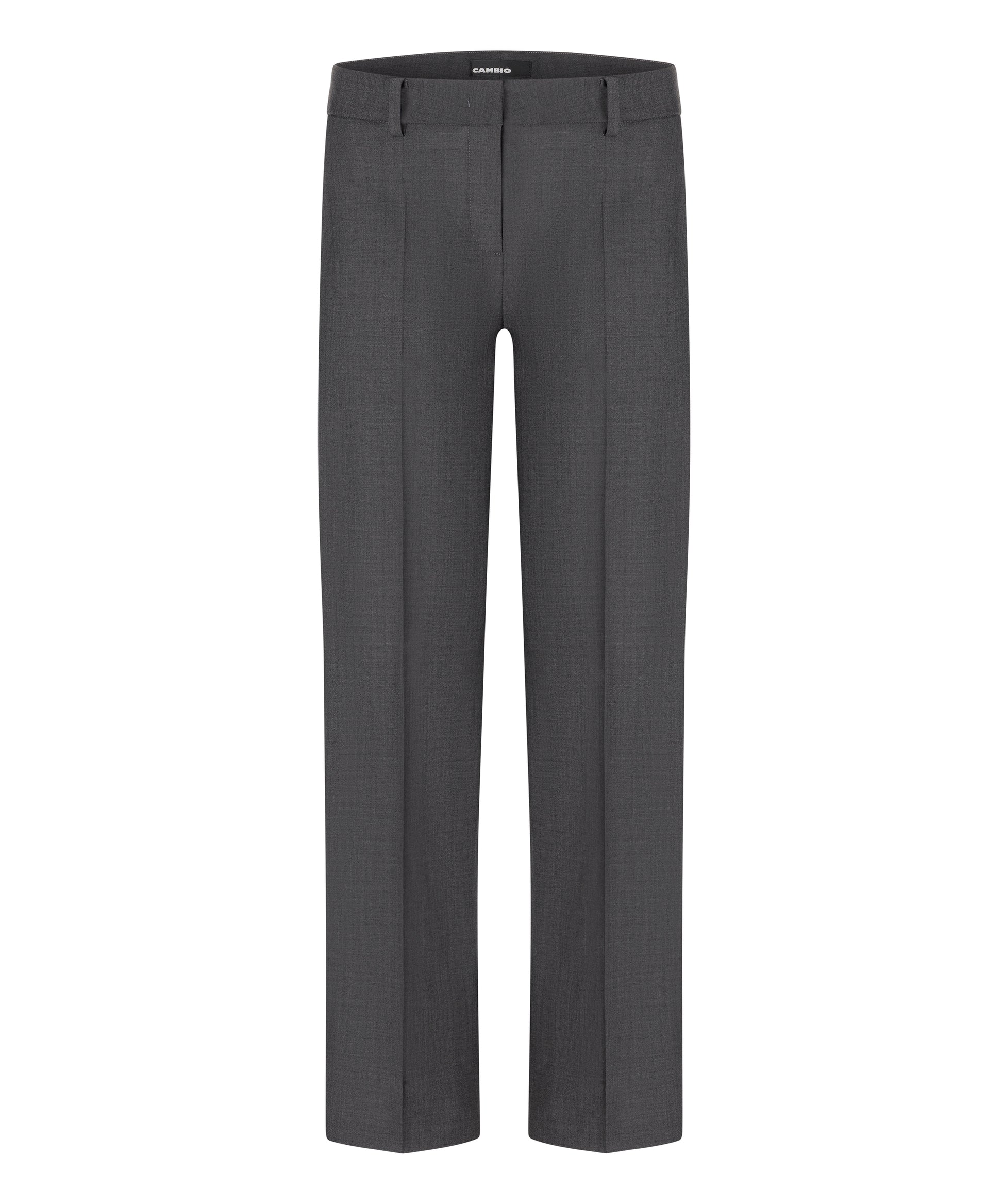 Wijde broek van Cambio, hoog in de taille, steekzakken en wijde pijpen. Langs de pijpen zit een gestreepte band in dezelfde kleur grijs.