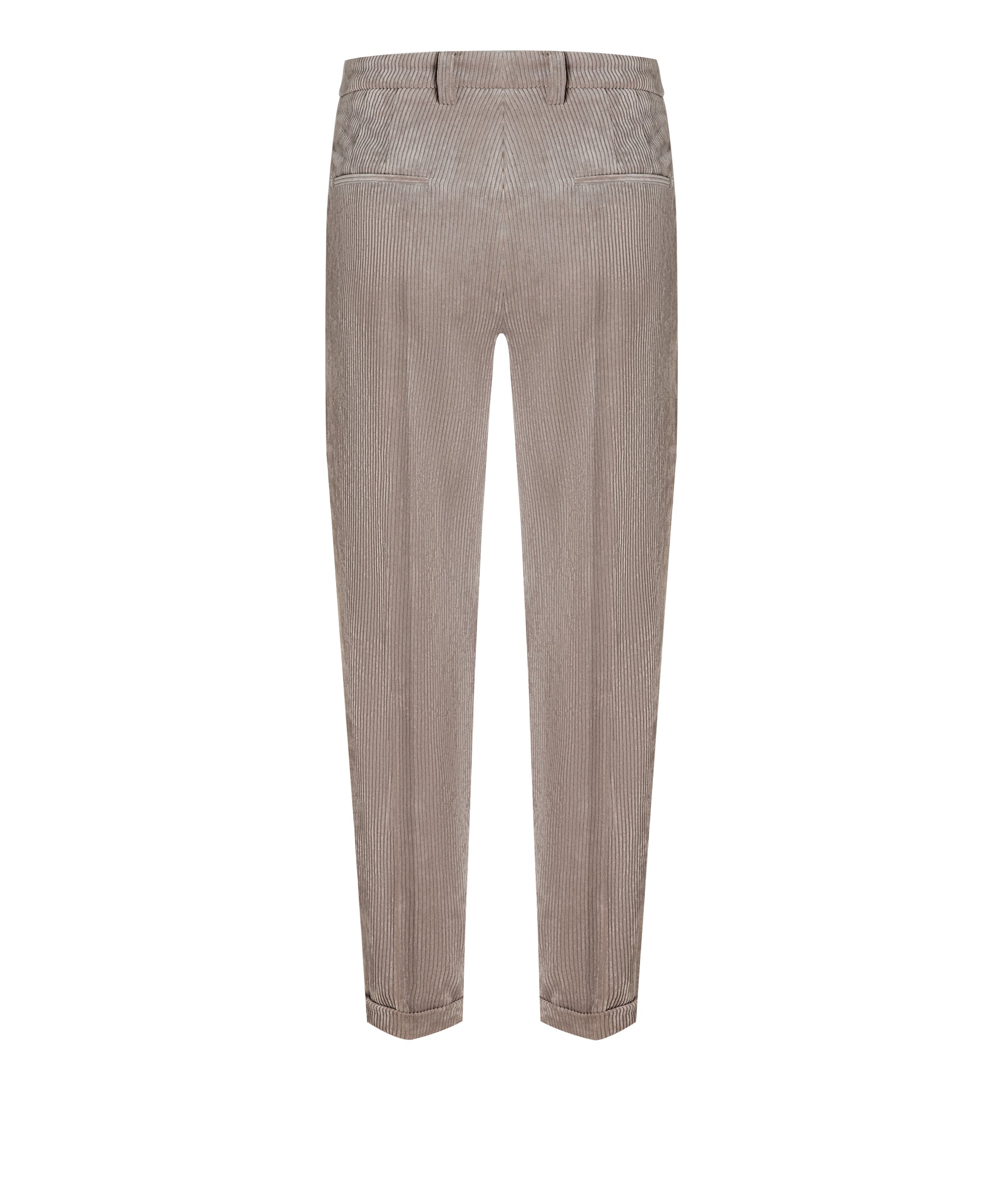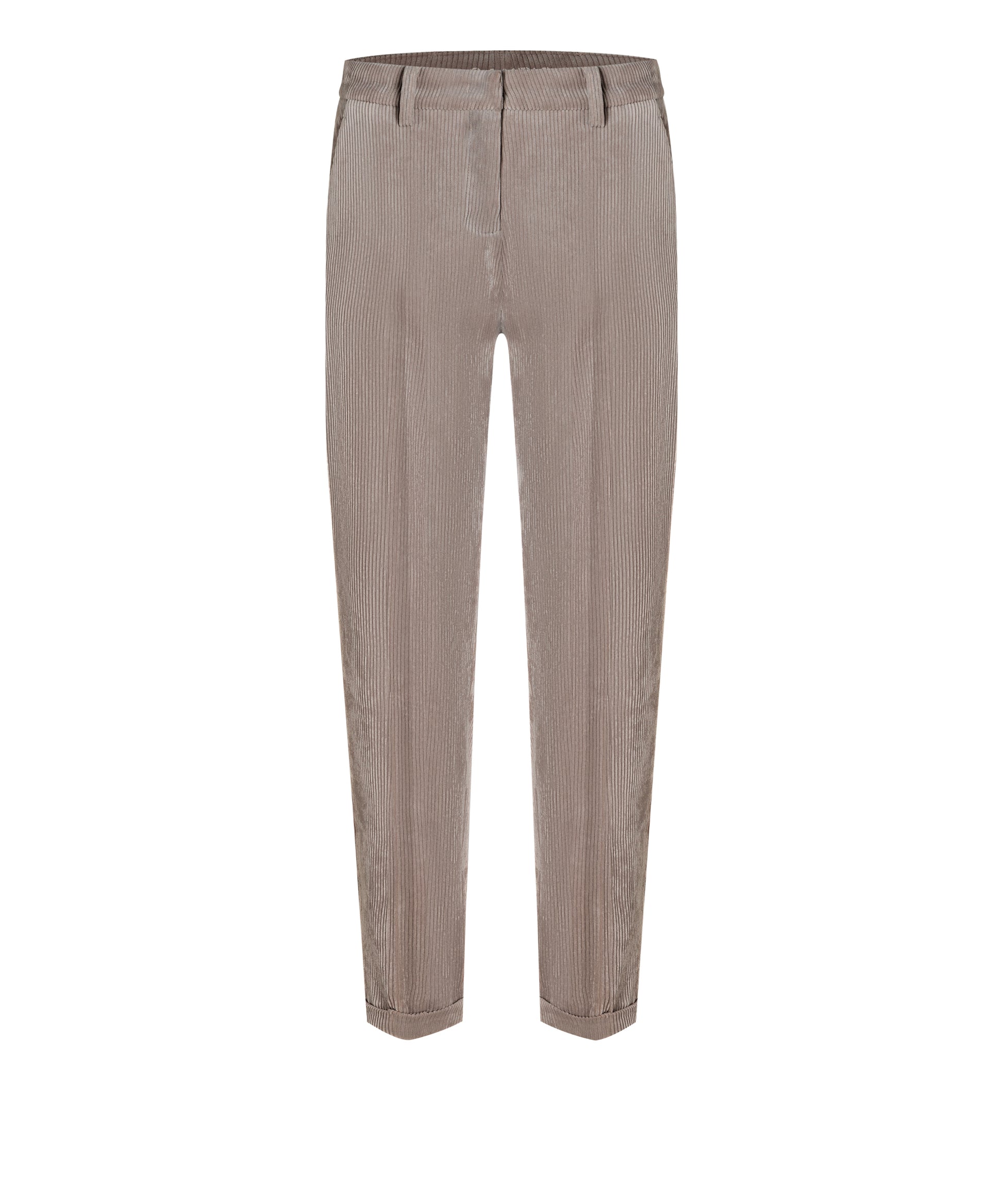 Broek van Cambio in een ribstof. Hoog in de taille, steekzakken, brede op de heupen en een omslag onderaan de pijpen.