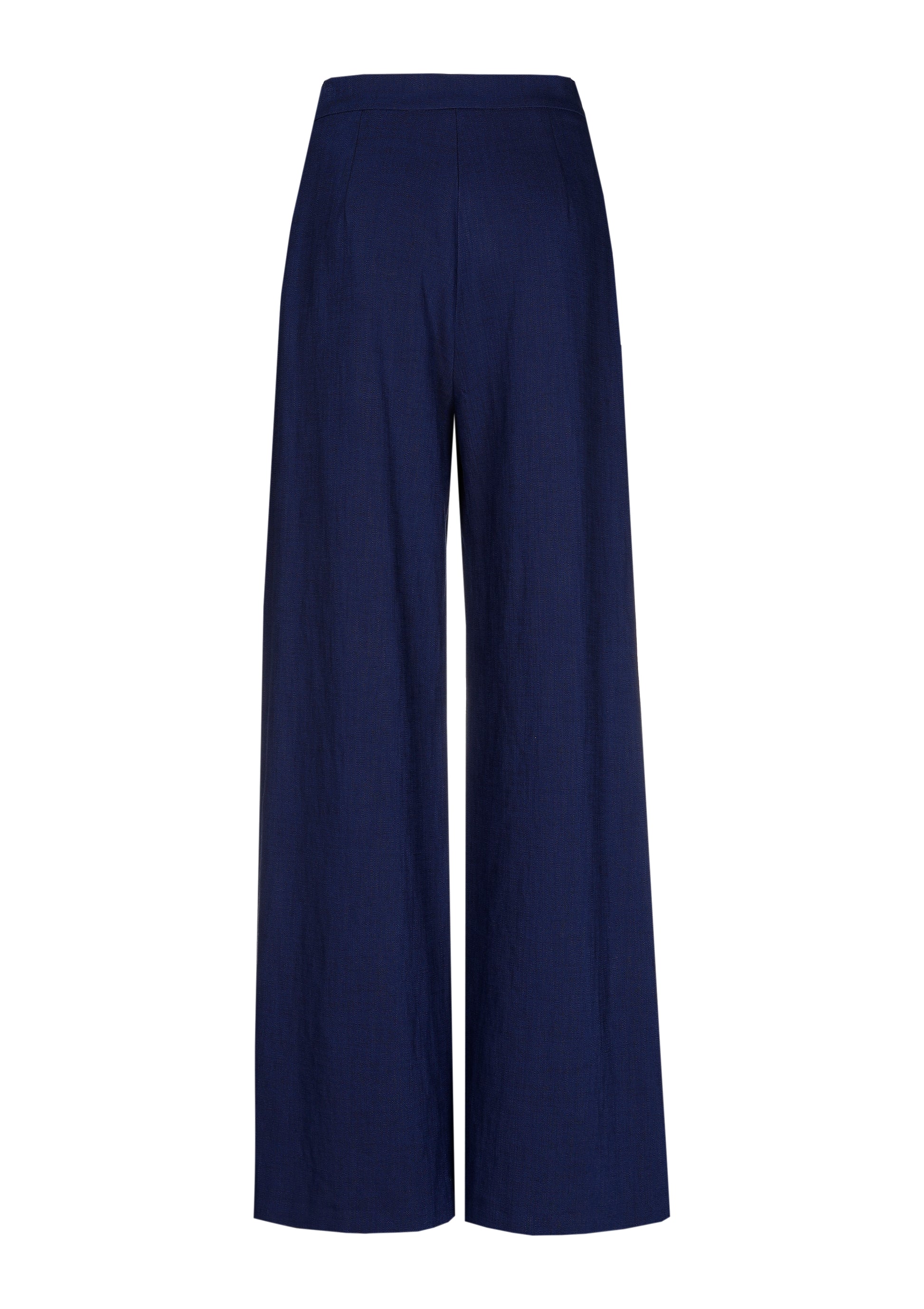 Donkerblauwe pantalon van Caroline Biss. Hoog in de taille, stolpplooi bij de zakken aan de voorkant en wijde pijpen.
