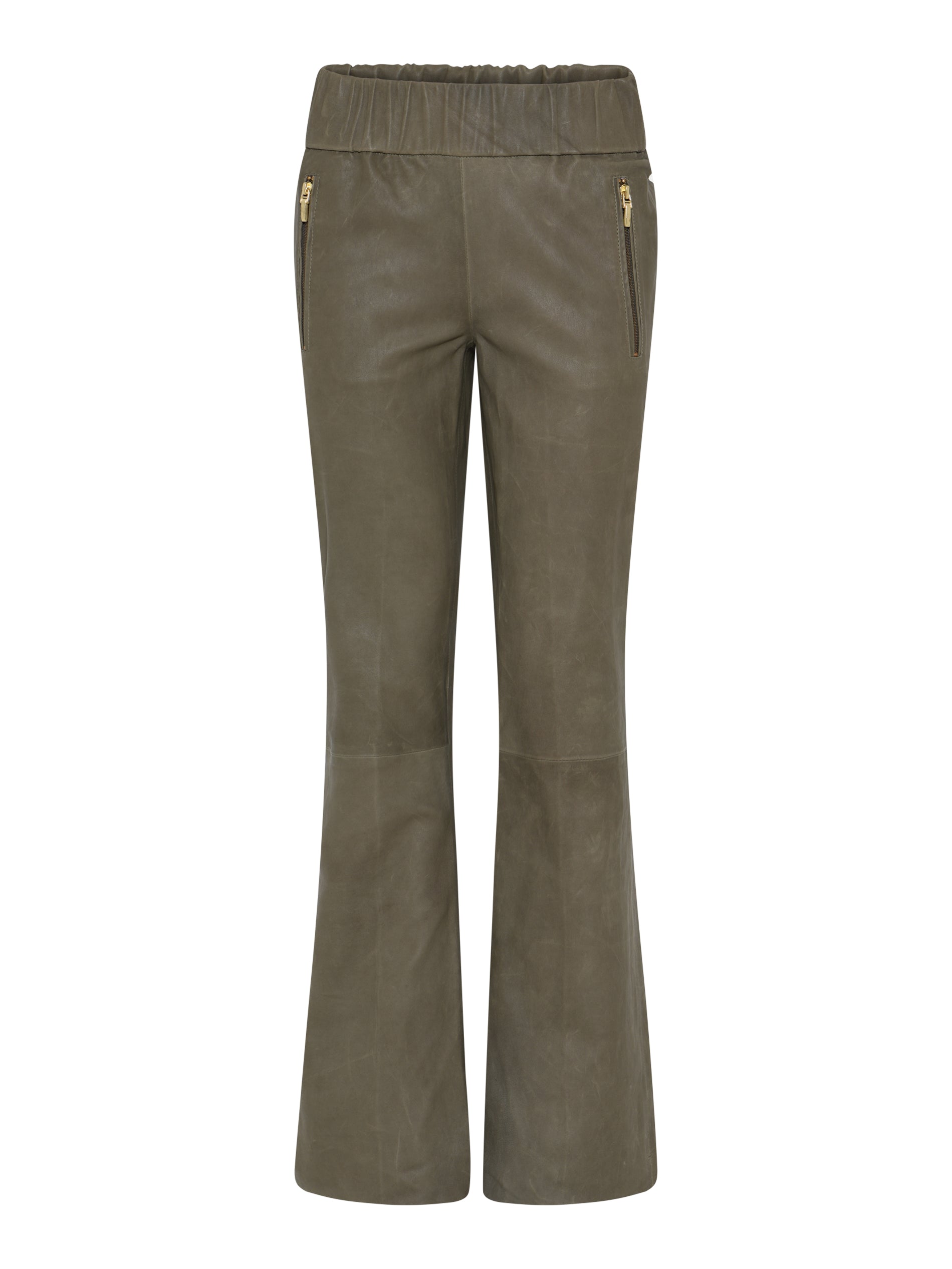 Leren broek van Gustav in het groen. Elastische boord, ritsjes aan de voorkant, strak op het bovenbeen en uitlopende pijpen. Kwaliteit: 100% Lamsleer. Lees meer