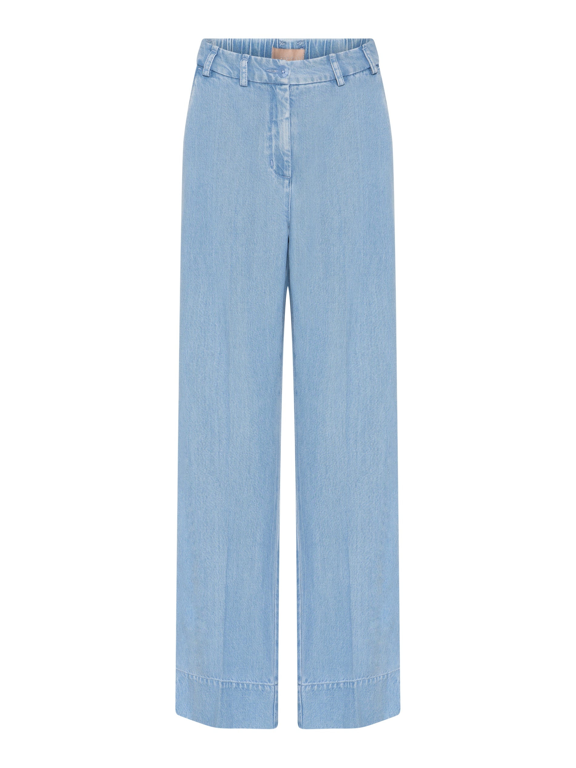 Wijde broek met van achteren een elastische boord en steekzakken.