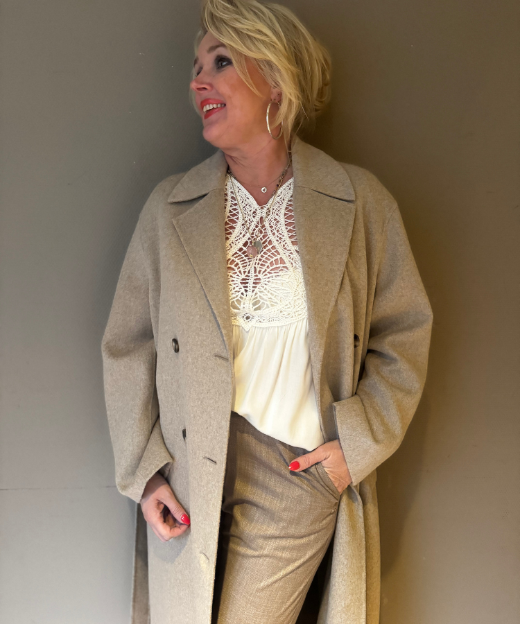 Lange jas, double breasted, van Studioar. Ongevoerd en steekzakken vanuit de zijnaad.