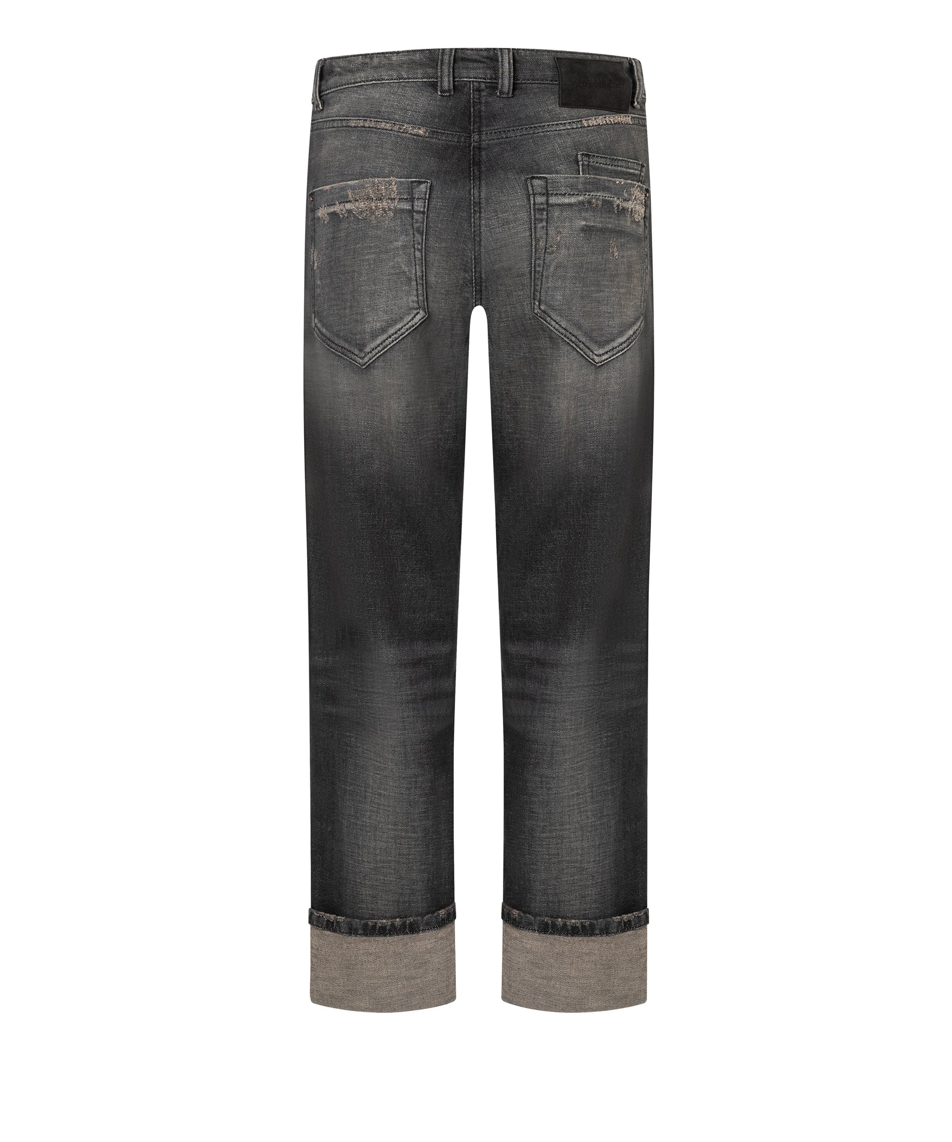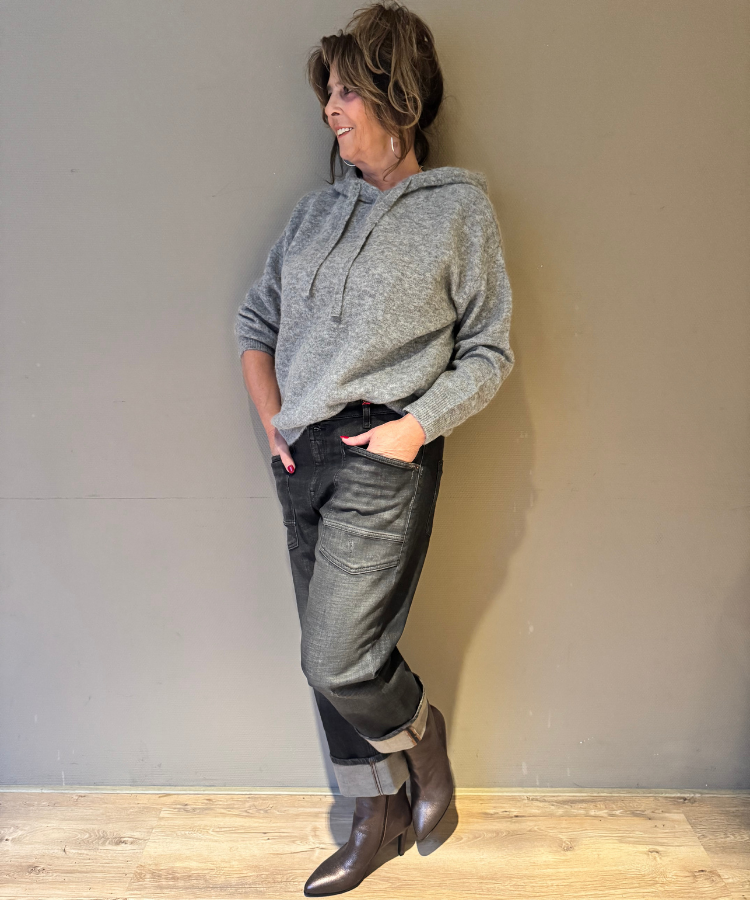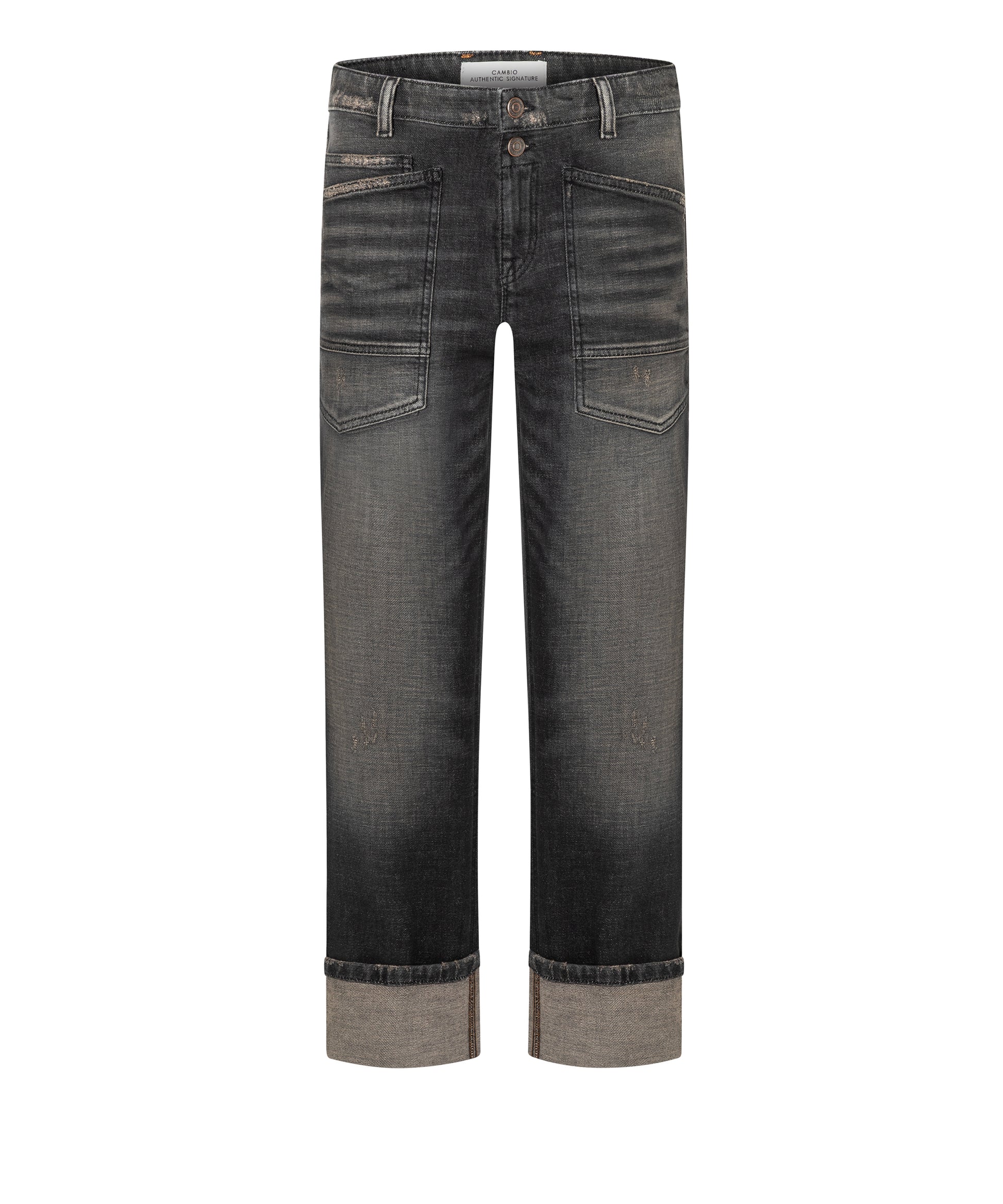 Jeans van Cambio in het bruin/zwart. Opgestikte zakken aan de voorkant, wat wijder op het bovenbeen en een brede omslag onderaan de pijpen. De maten vallen wat ruimer.