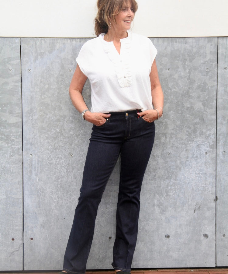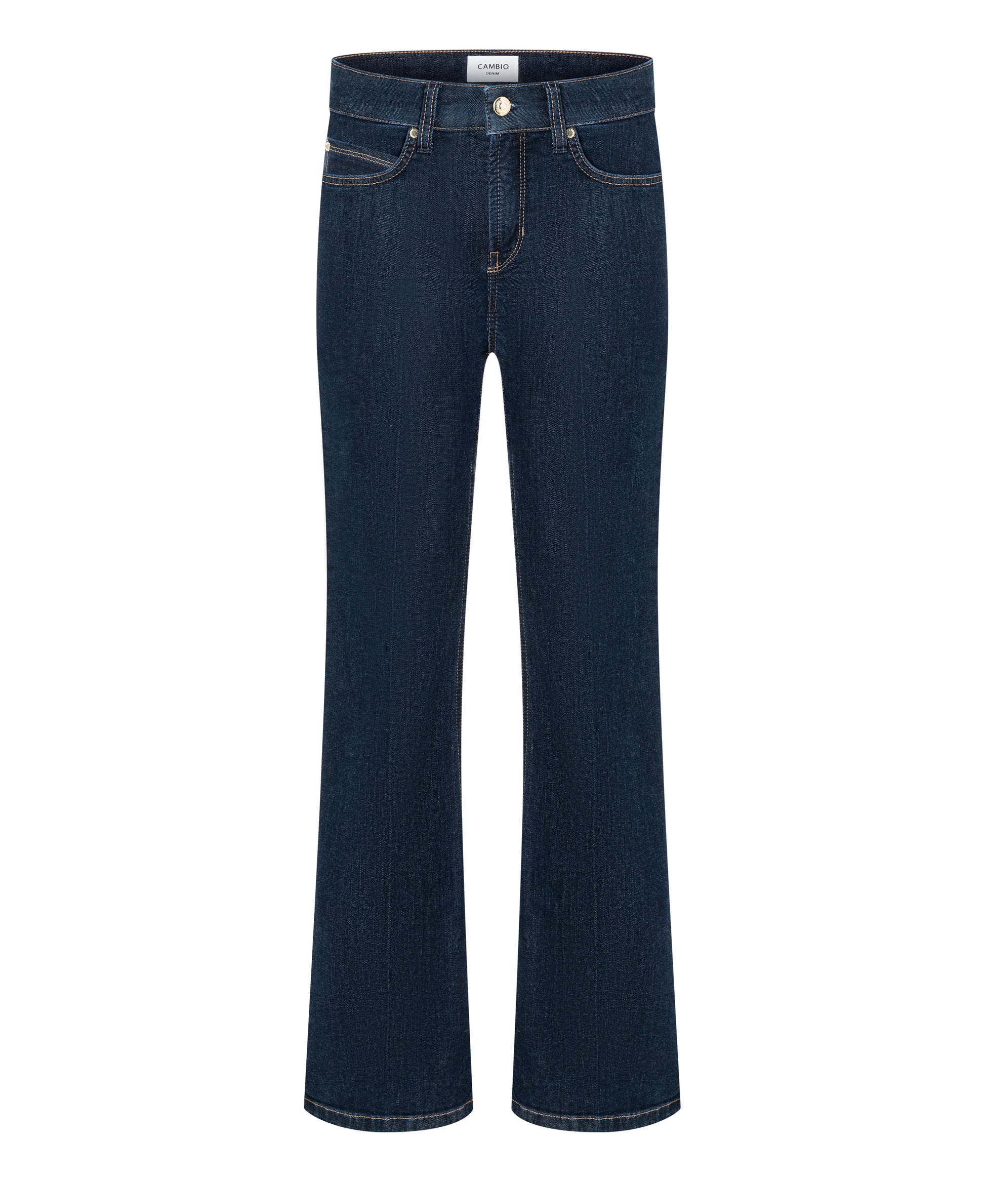 Jeans van Cambio in een donkere wassing. Hoog in de taille en uitlopende pijpen.