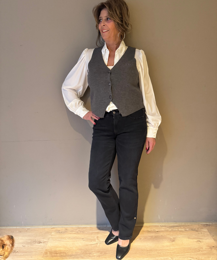 Donker grijze heans van Cambio. Hoog in de taille, strak op het bovenbeen en rechte pijpen.