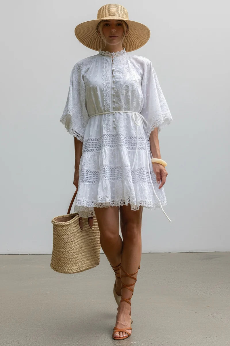 De Villa Mini Dress is een lichte, romantische interpretatie van het Villa-silhouet, ontworpen voor warme dagen en moeiteloze styling. Gemaakt van een verfijnde mix van getextureerde katoenen stoffen, is de jurk voorzien van delicate kanten inzetstukken en zacht borduurwerk dat een vintage-achtige charme geeft. Een licht elastische taille en een aparte ceintuur van dezelfde stof zorgen voor een comfortabele maar getailleerde pasvorm.
