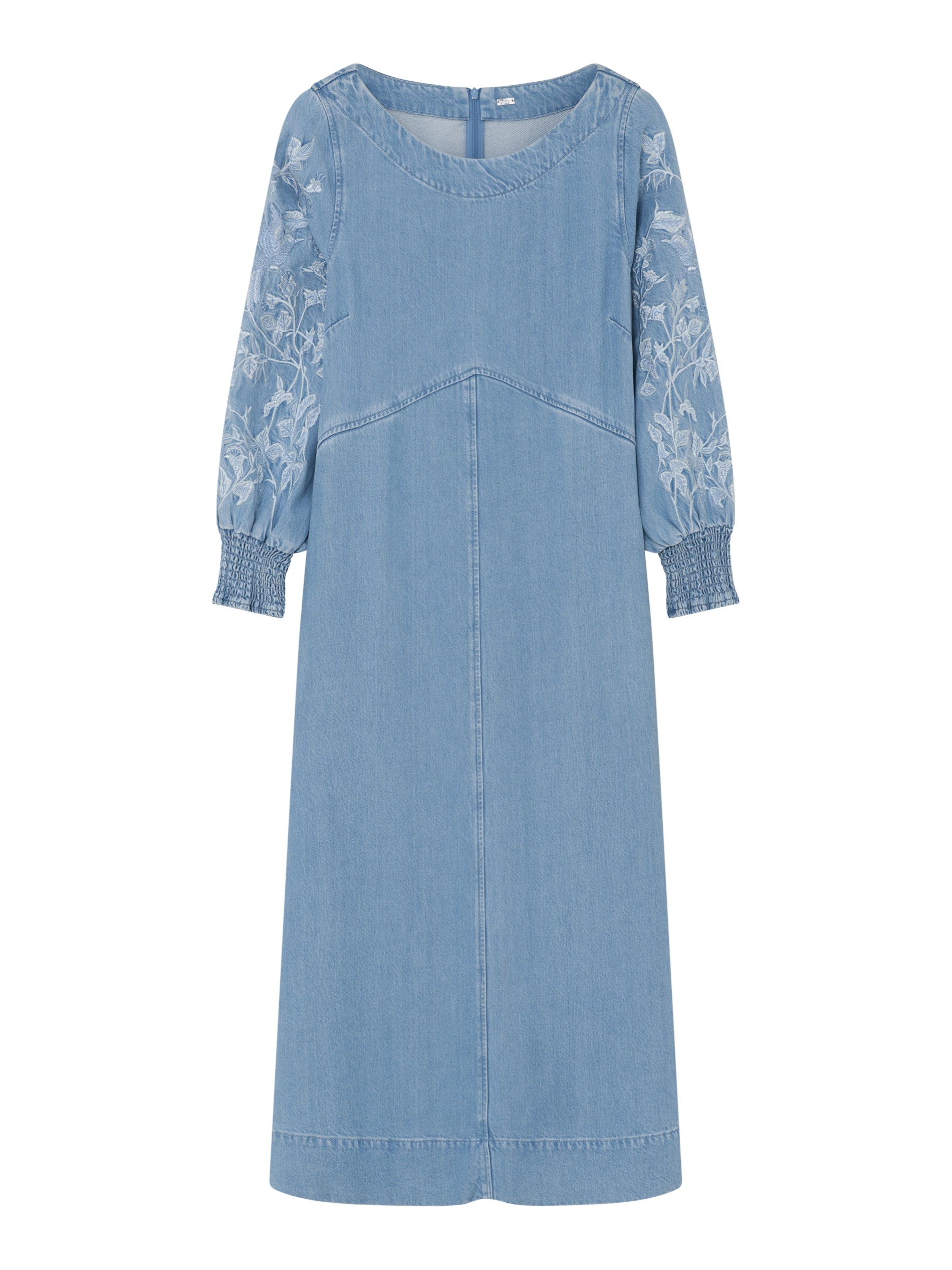 Slankmakende jurk in een lichte jeans kleur. Ronde halslijn en borduursel op de mouwen met elastische manchetten.