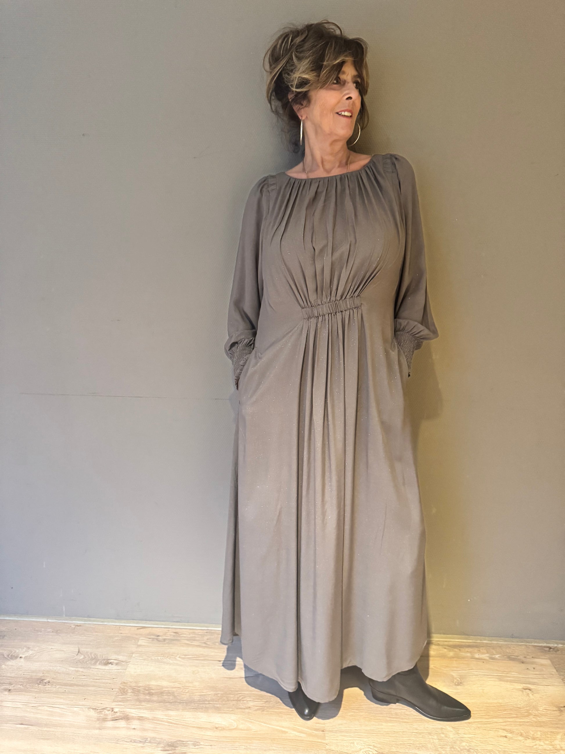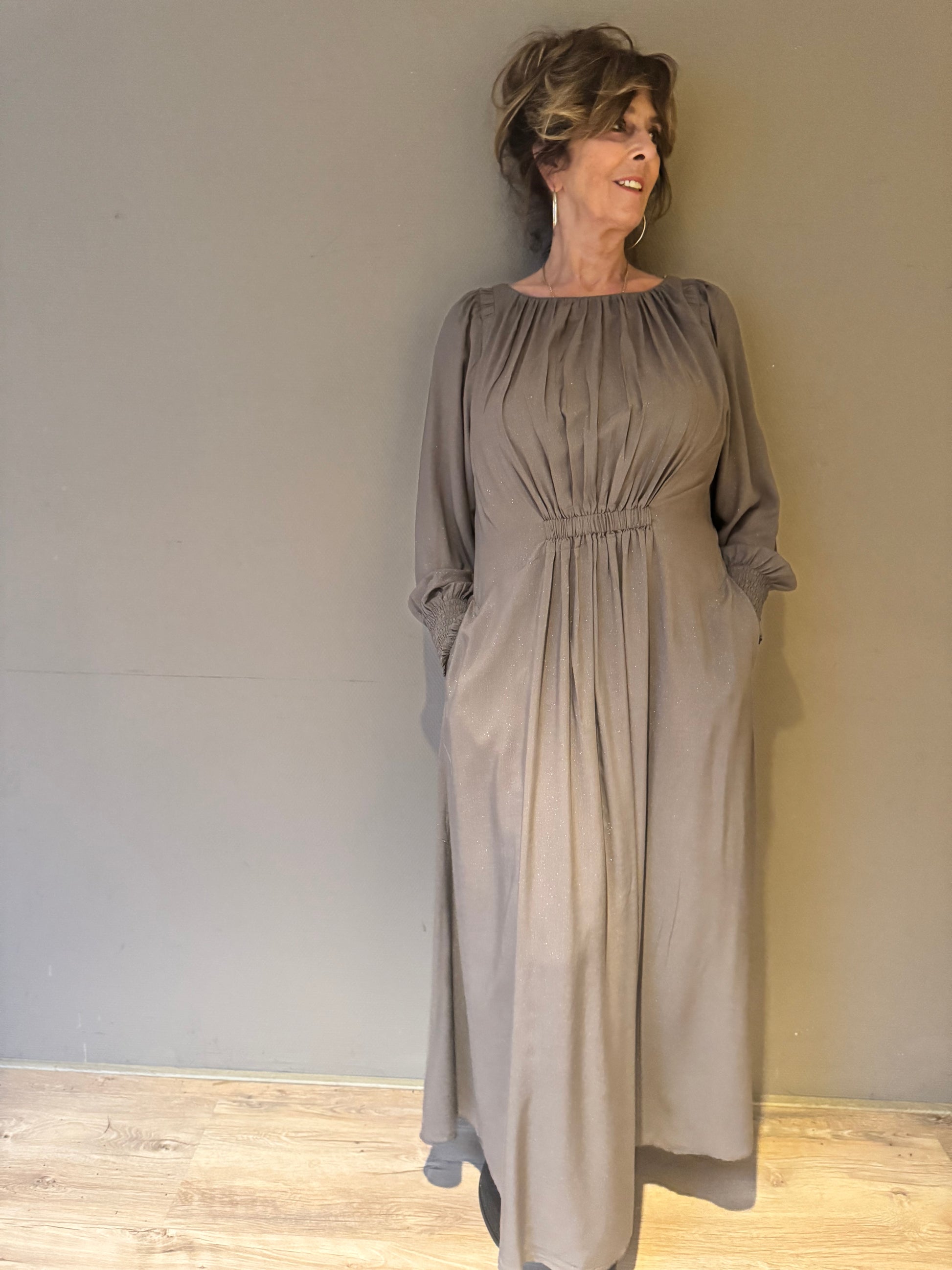 Wijdvallende jurk van Gustav met een klein stukje elastiek aan de vooren achterkant in de taille. Dunne stof met een glitter en de maten vallen erg ruim.