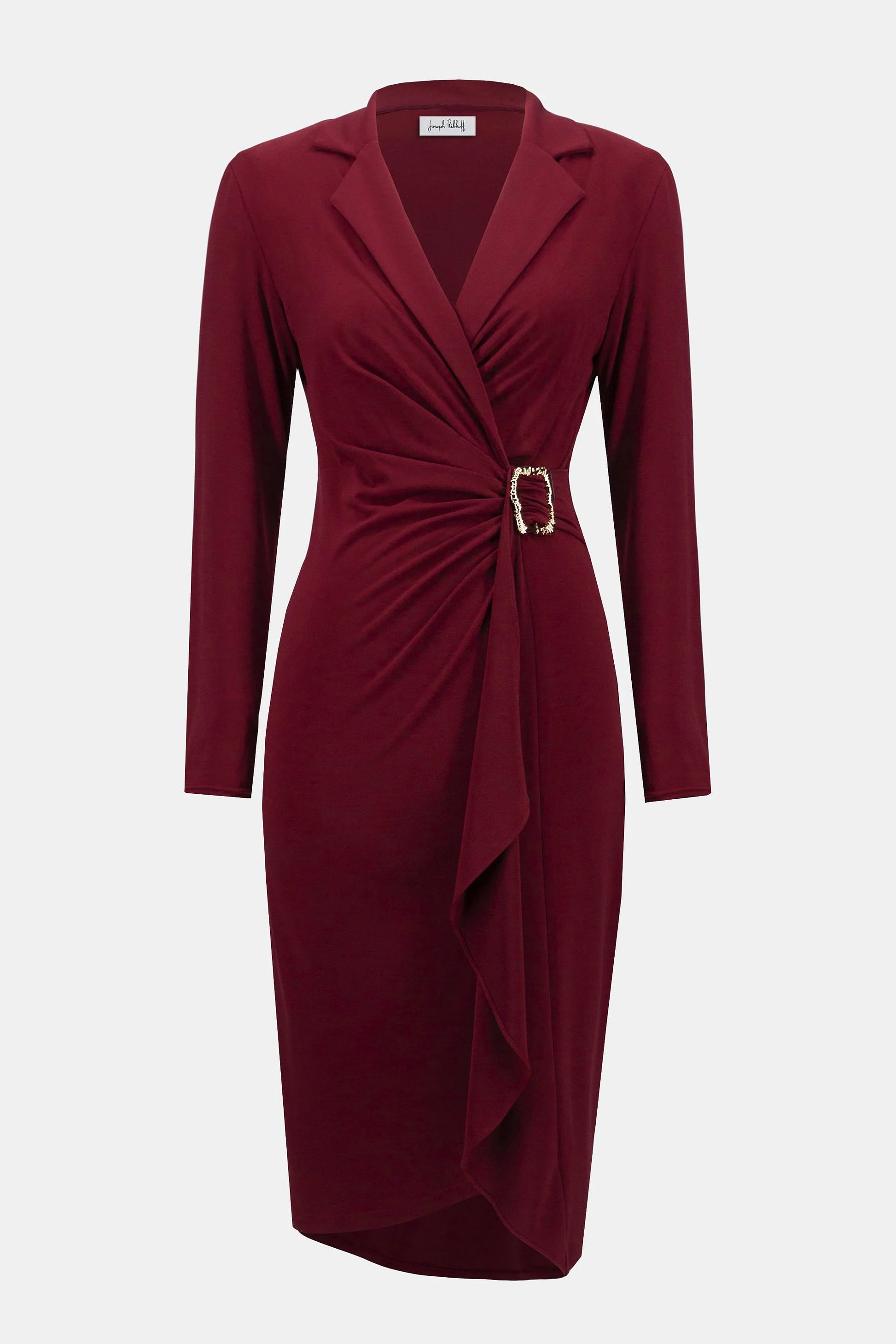 Deze jurk van mosgroen crêpetricot belichaamt eigentijdse glamour. De wikkelhals met inkeping past perfect bij het kokermodel en voegt een elegante, getailleerde look toe. De drapering aan de zijkanten en het gepolijste gespdetail zorgen voor een vleugje dramatische flair.