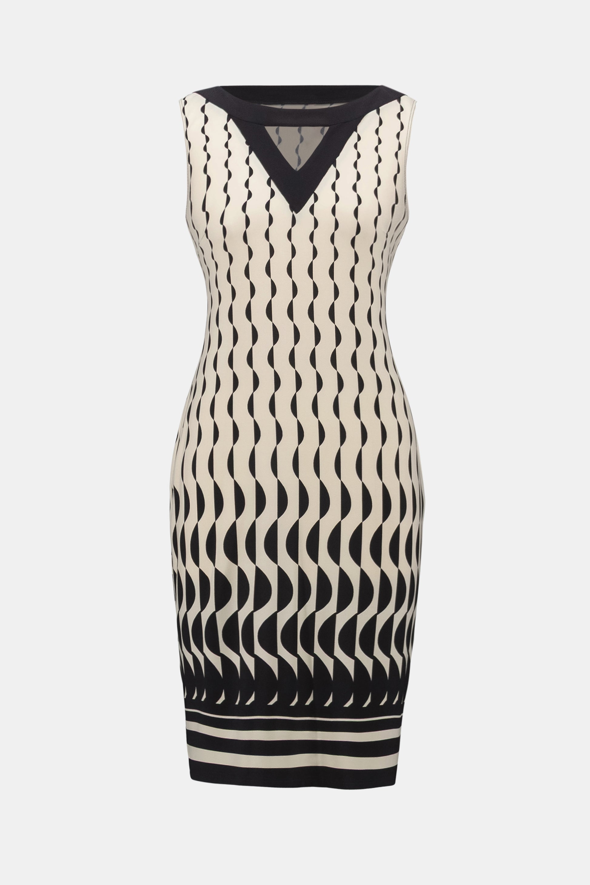 Een contrasterende halslijn met een sleutelgatdetail geeft deze zijdezachte gebreide kokerjurk een moderne uitstraling. De geometrische print en mouwloze snit zorgen voor een strakke look, terwijl de knielengte de jurk geschikt maakt voor zowel overdag als 's avonds.
