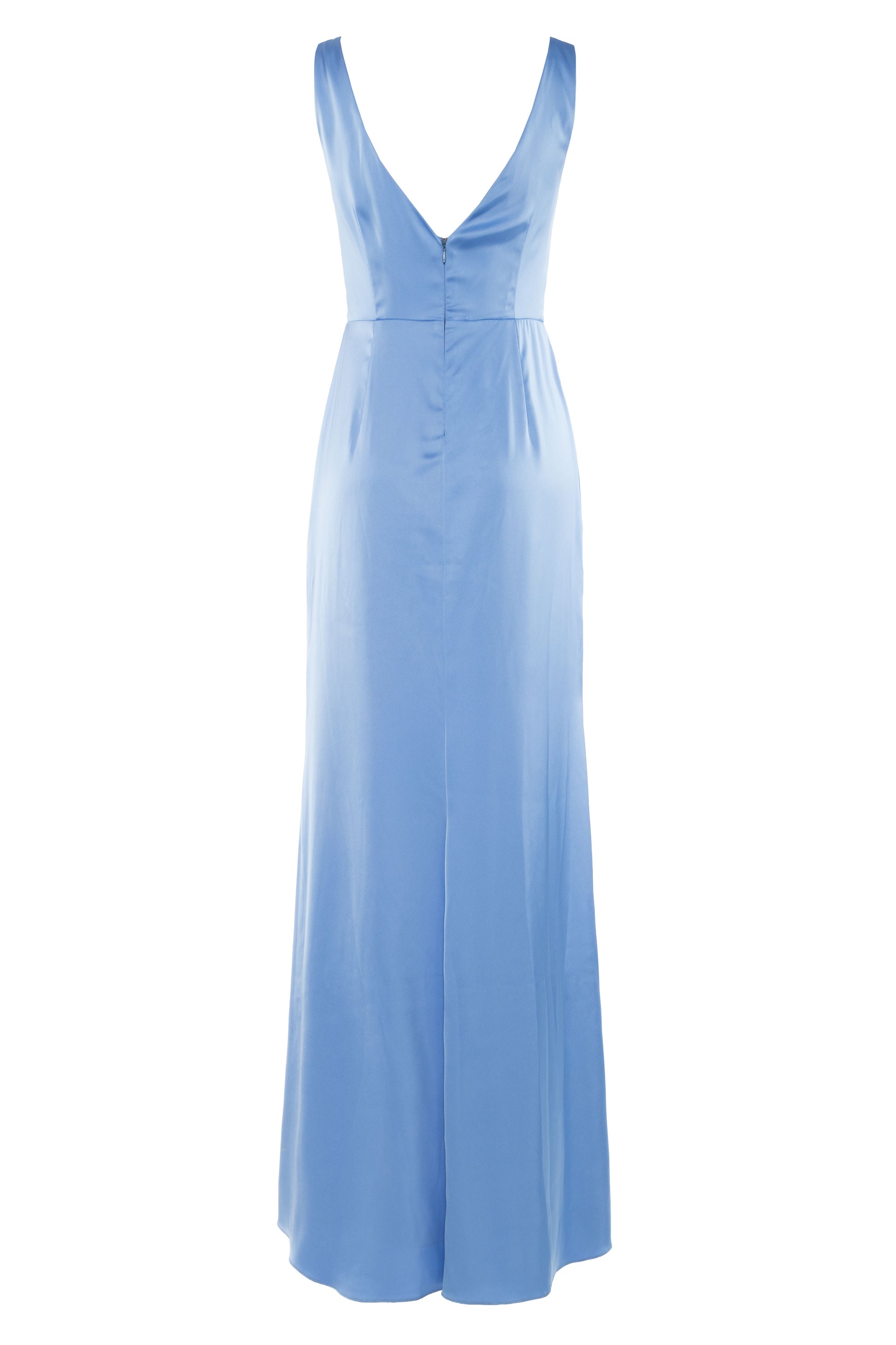 Elegante lange jurk van zijdezacht satijn. Het ontwerp kenmerkt zich door een V-hals met een verfijnde knoop in het midden die het decolleté accentueert en een delicate valling creëert. Het vloeiende silhouet glijdt soepel langs het lichaam, aangevuld met een lage rug en een praktische, onzichtbare ritssluiting.