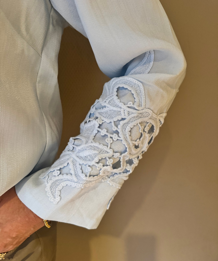 Zeer uitgewerkte top van Gustav. Kleine knoopjes aan de voorkant en met een soort kant op de mouwen.