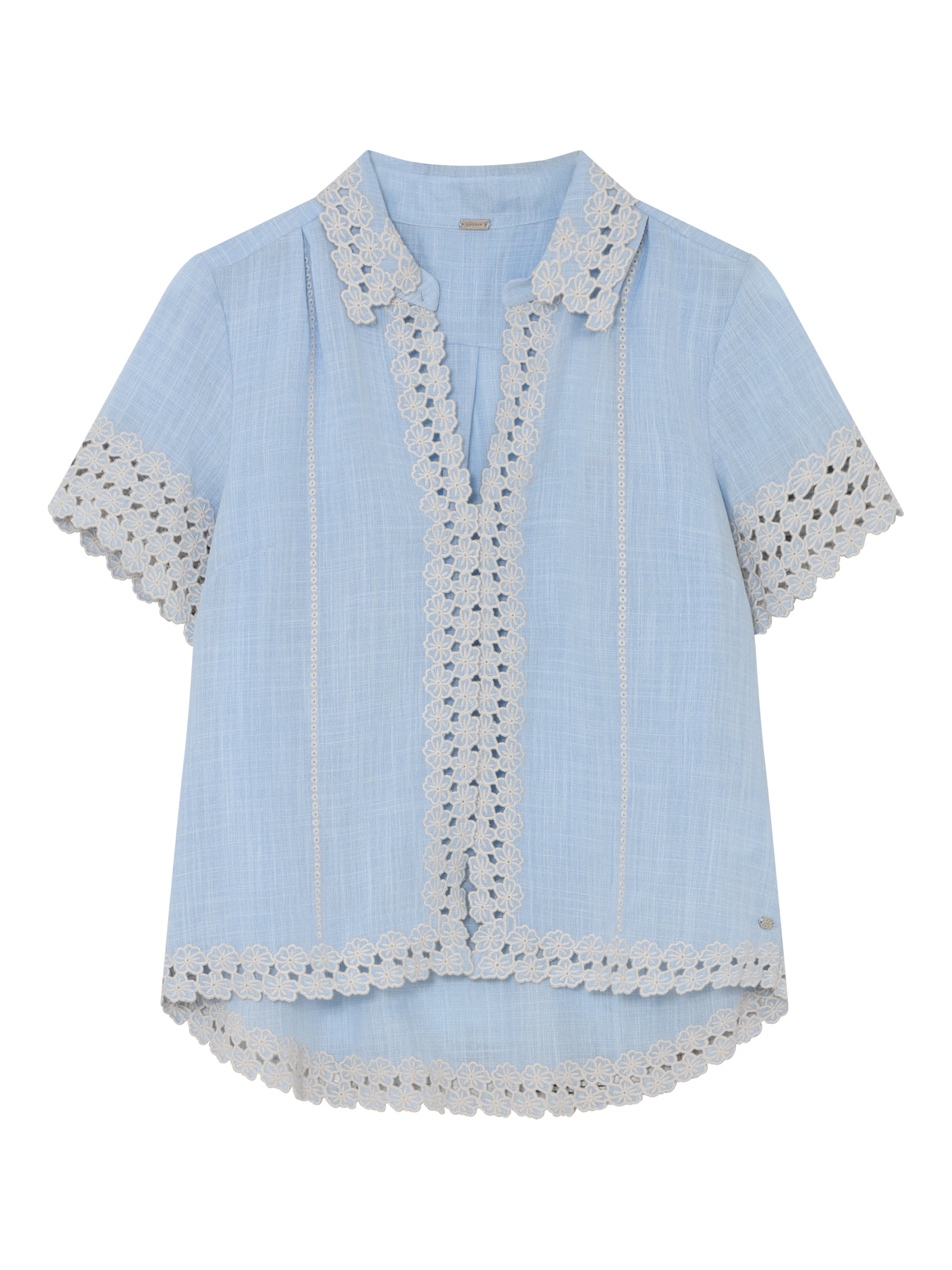 Baby blauwe top met prachtige afwerkingen bij de kraag, mouwen en onderaan bij boord.