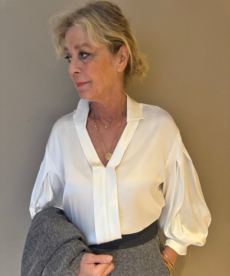Glansrijke top van Gustav waar diepe plooien zijn verwerkt in de mouwen.