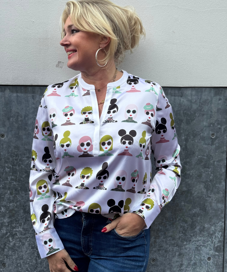 Prachtige, stretchzijden top van Herzen's Angelegenheit met grappige gezichten als afbeeldingen.