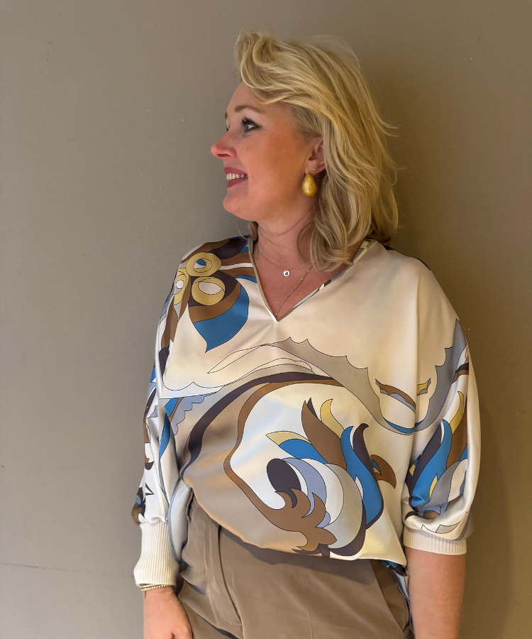 Stretchzijden top van Herzen's Angelegenheit met aangeknipte mouwen, v0hals en elastische manchetten.