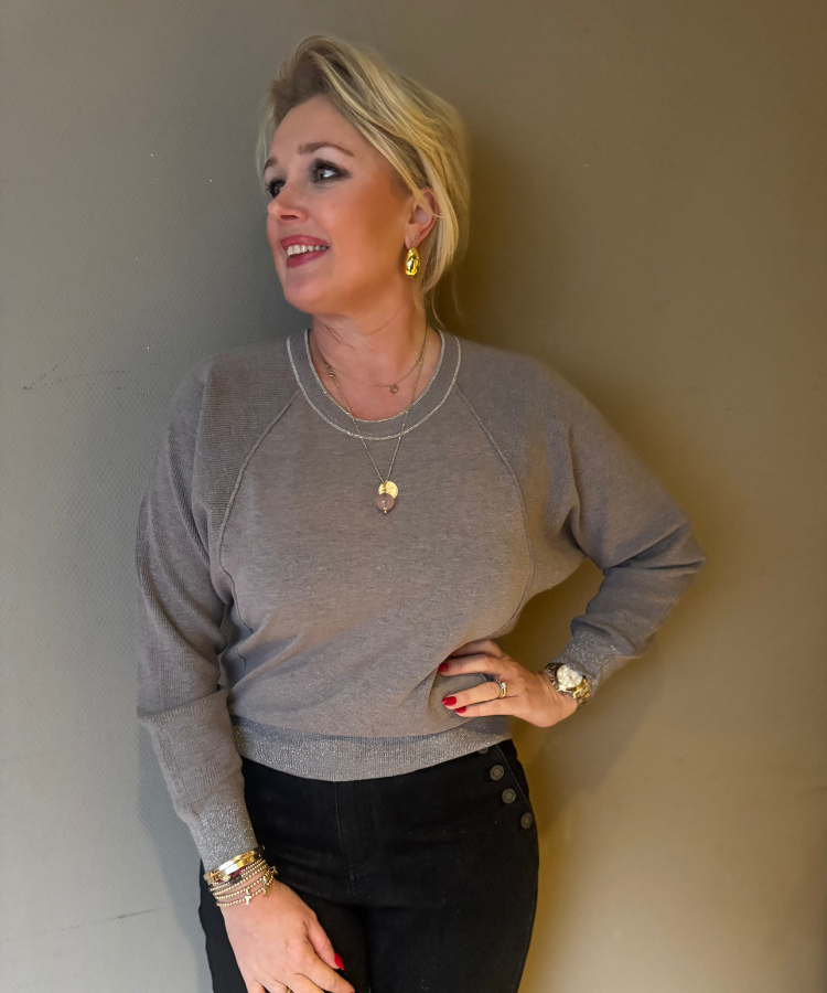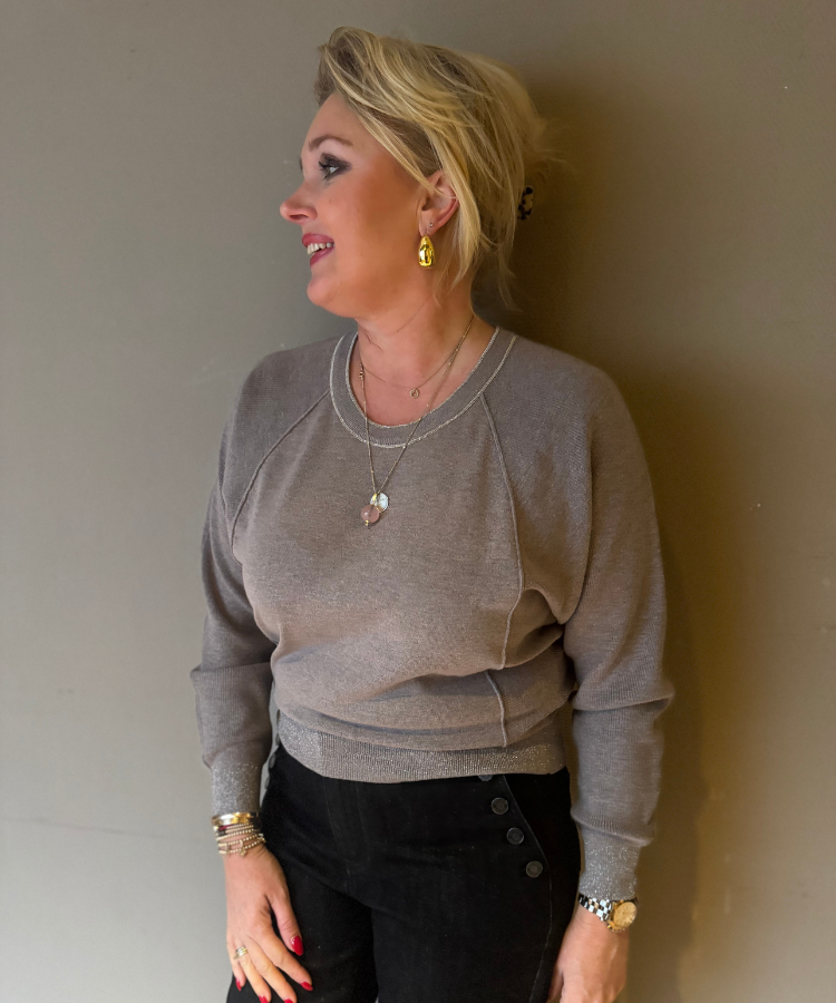 Gebreide top van Leo & Ugo met raglanmouwen en versiersel bij de halslijn. De boord is bewerkt met lurex.