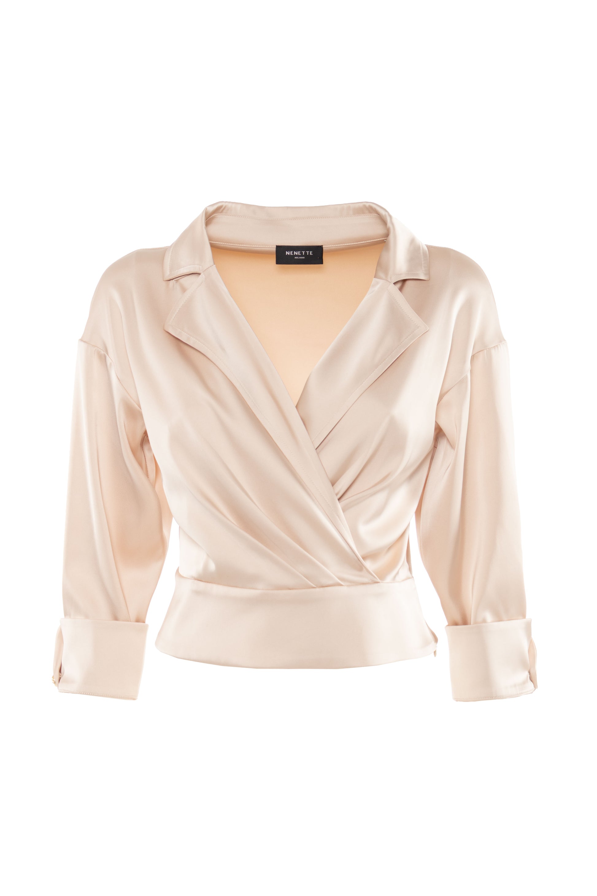 Verfijnde wikkelblouse van satijn met een zijdeachtige glans. Het ontwerp kenmerkt zich door een elegante V-hals met puntrevers en een gestructureerd silhouet met een brede, hoge tailleband. De driekwartmouwen, afgewerkt met brede, met juwelen versierde manchetten, maken de geraffineerde look compleet, ideaal voor formele gelegenheden of exclusieve avonden.