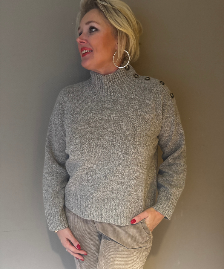 Gemeleerde trui van HET Amsterdam. Opstaande kraag, aan 1 kant knopen op de schoudernaad en brede manchetten.