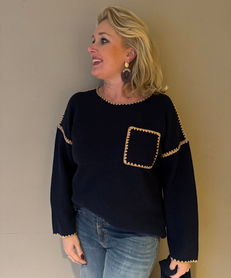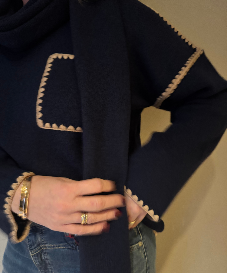 Prachtige trui met bijpassende sjaal van Leo & Ugo. Let vooral op de mooie afwerkingen bij de randen en borstzak.