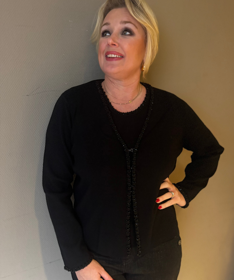 Fijn gebreid twin-set van Leo & Ugo. Mouwloze top met ronde halslijn welke is bewerkt met kralen. Ook het vest heeft deze subtiele kraaltjes langs de sluiting en onderaan de mouwen. Als sluiting heeft deze drie haakjes.